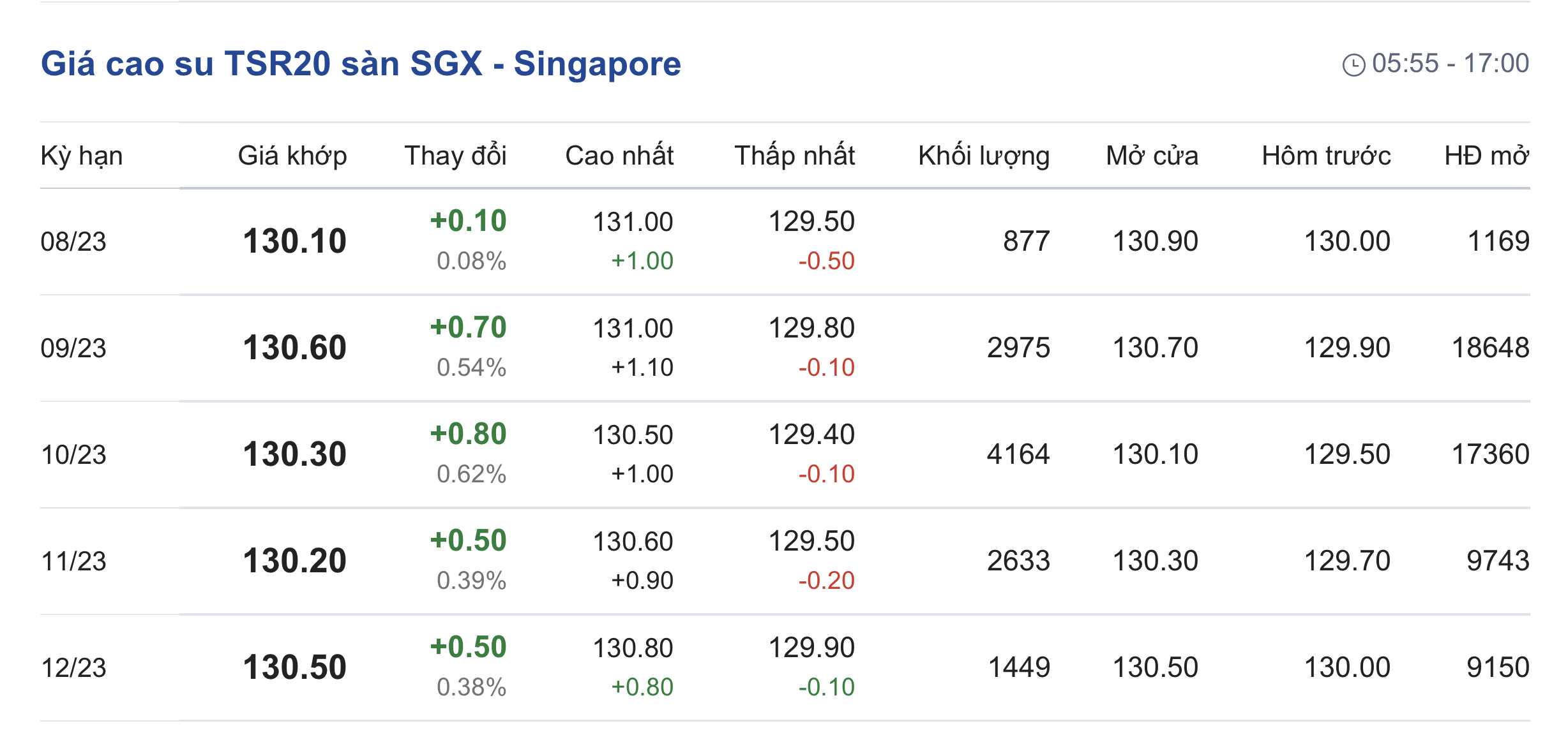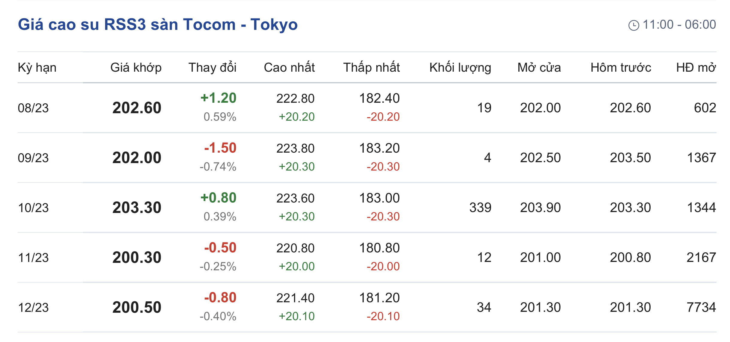 Tại Sở giao dịch hàng hóa Tokyo (TOCOM), giá cao su kỳ hạn giao tháng 8/2023 đạt mức 202,6 yen/kg, tăng 0,59% (tương đương 1,2 yen/kg) tại thời điểm khảo sát vào lúc 6h30 (giờ Việt Nam).