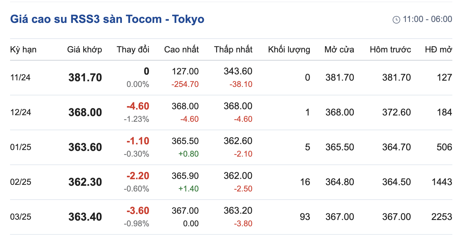 Tại sở hàng hoá Tokyo (TOCOM) – Nhật Bản, giá cao su  RSS3 tiếp đà giảm mạnh 1,23% xuống mức 368 yen/kg đối với hợp đồng giao kỳ hạn tháng 12/2024; đối với hợp đồng giao tháng 1/2025 giảm 1,1 yen xuống mức 363,6 yen/kg