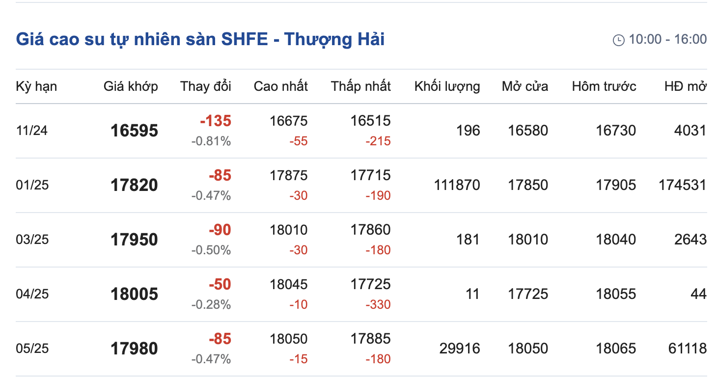 Trên Sàn Giao dịch Hàng hóa Thượng Hải (SHFE) - Trung Quốc, hợp đồng cao su thiên nhiên giao tháng 1/2025 đạt mức 17.960 nhân dân tệ/tấn sau khi giảm 85 nhân dân tệ/tấn (tương đương giảm 0,47%).