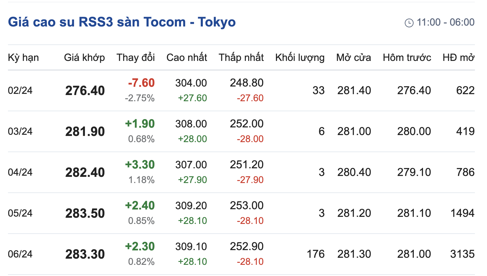 Tại Sở giao dịch hàng hóa Tokyo (TOCOM), giá cao su kỳ hạn giao tháng 2/2024 đạt mức 276,4 yen/kg, giảm 2,75% (tương đương 7,6 yen/kg) tại thời điểm khảo sát vào lúc 6h48 (giờ Việt Nam).