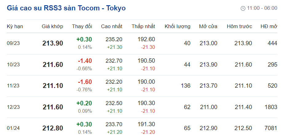 Tại Sở giao dịch hàng hóa Tokyo (TOCOM), giá cao su kỳ hạn giao tháng 9/2023 đạt mức 213,9 yen/kg, tăng 0,14% (tương đương 0,3 yen/kg) tại thời điểm khảo sát vào lúc 6h45 (giờ Việt Nam).