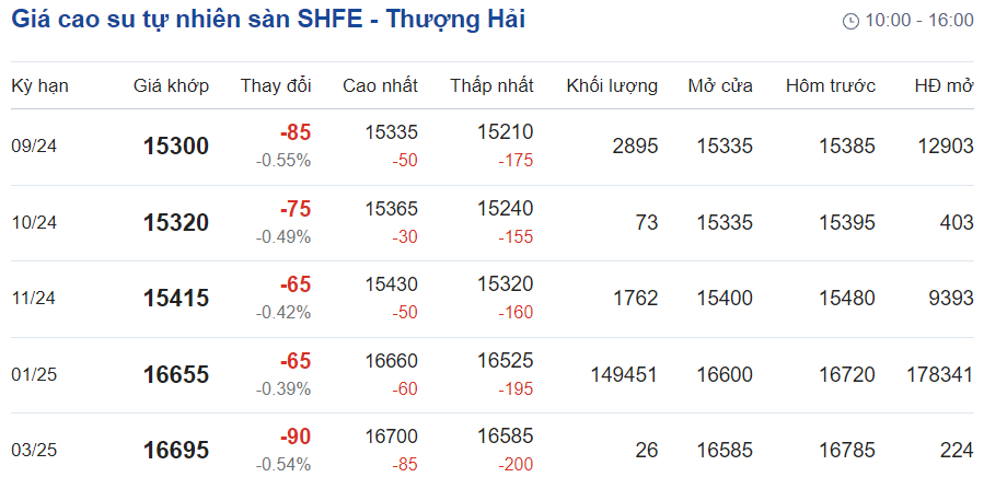 Trên Sàn giao dịch hàng hóa tương lai Thượng Hải (SHFE), giá cao su RSS3 giao kỳ hạn tháng 1/2025 giảm 0,39% ở mức 16.655 nhân dân tệ/tấn.