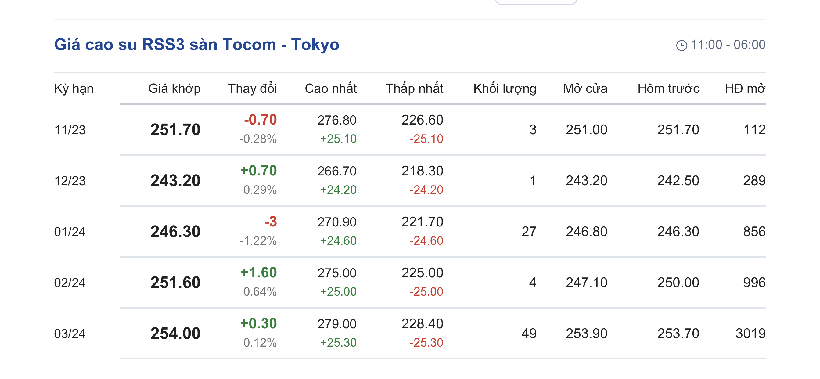 Tại Sở giao dịch hàng hóa Tokyo (TOCOM), giá cao su kỳ hạn giao tháng 11/2023 đạt mức 251,7 yen/kg, giảm 0,28% (tương đương 0,7 yen/kg) tại thời điểm khảo sát vào lúc 6h18 (giờ Việt Nam).