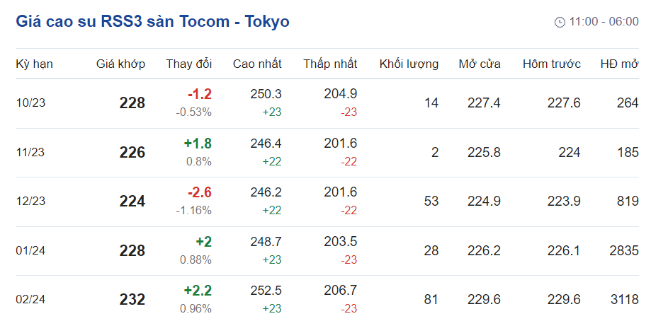 Tại Sở giao dịch hàng hóa Tokyo (TOCOM), giá cao su kỳ hạn giao tháng 10/2023 đạt mức 228 yen/kg, giảm 0,53% (tương đương 1,2 yen/kg) tại thời điểm khảo sát vào lúc 6h45 (giờ Việt Nam).