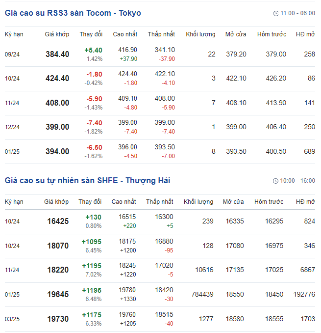 Kết thúc phiên giao dịch ngày 3/10, hợp đồng cao su giao tháng 11 trên sàn giao dịch Tocom(Tokyo) giảm 1,43% (tương ứng 5,9 yen/kg), xuống còn 408 yen/kg. Tuy nhiên, hợp đồng giao tháng 12 cũng giảm về mức 399 yen/kg do đồng Yen yếu hơn đã hỗ trợ phần nào cho thị trường.