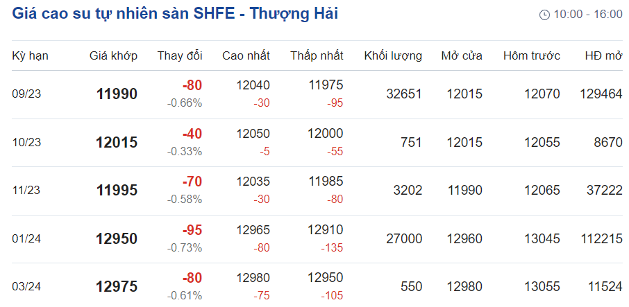 Trên Sàn giao dịch hàng hóa tương lai Thượng Hải (SHFE), giá cao su RSS3 giao kỳ hạn tháng 8/2023 được điều chỉnh xuống mức 11.950 nhân dân tệ/tấn, giảm 1,61% (tương đương 195 nhân dân tệ) so với giao dịch trước đó.
