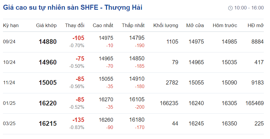 Giá cao su tự nhiên trên Sàn giao dịch hàng hóa Thượng Hải (SHFE) – Trung Quốc cũng giảm 0,7% xuống còn 14.880 nhân dân tệ/tấn đối với hợp đồng giao tháng 9 và 15.005 nhân dân tệ/tấn đối với hợp đồng giao tháng 11/2024.