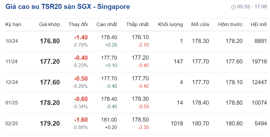 Tương tự, giá cao su TSR20 tại Sở Giao dịch Singapore (SGX) giao kỳ hạn tháng 10/2024 giảm 0,79% xuống mức 176,8 US cent/kg so với cuối phiên liền trước. Kỳ hạn giao hàng tháng 1/2025 là 178,2 US cent/kg giảm 0,34%. Kỳ hạn giao hàng tháng 2/2025 là 179,2 US cent/kg giảm 0,88%.