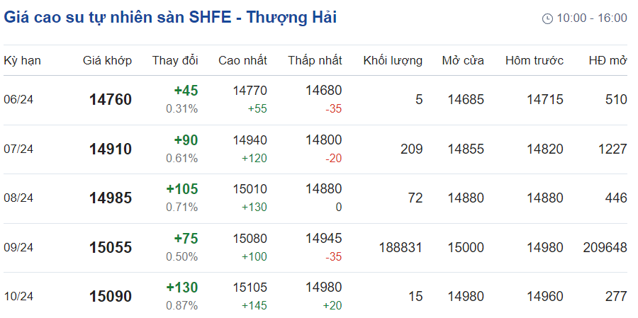 Trên Sàn giao dịch hàng hóa tương lai Thượng Hải (SHFE), giá cao su RSS3 giao kỳ hạn tháng 6/2024 tăng 0,31% ở mức 14.760 nhân dân tệ/tấn.