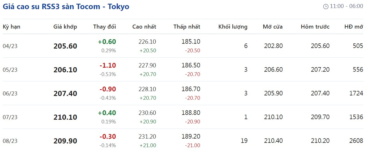 Tại Sở giao dịch hàng hóa Tokyo (TOCOM), giá cao su kỳ hạn giao tháng 4/2023 đạt mức 205,6 yen/kg, tăng 0,29% (tương đương 0,6 yen/kg) tại thời điểm khảo sát vào lúc 6h35 (giờ Việt Nam).