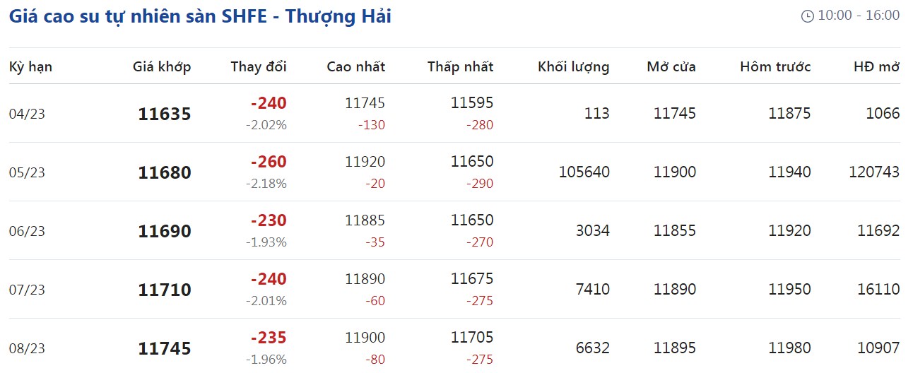 Trên Sàn giao dịch hàng hóa tương lai Thượng Hải (SHFE), giá cao su RSS3 giao kỳ hạn tháng 4/2023 được điều chỉnh xuống mức 11.635 nhân dân tệ/tấn, giảm 2,02% (tương đương 240 nhân dân tệ) so với giao dịch trước đó.