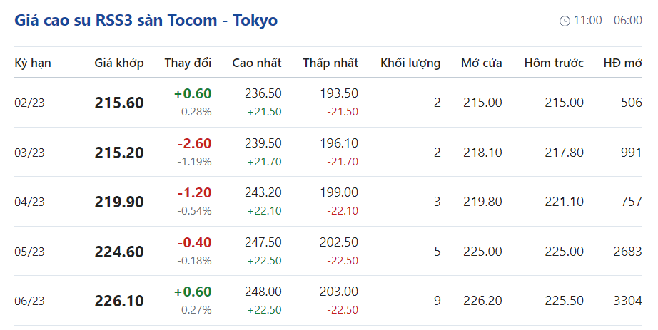 Tại Sở giao dịch hàng hóa Tokyo (TOCOM), giá cao su kỳ hạn giao tháng 2/2023 đạt mức 215,6 yen/kg, tăng 0,28% (tương đương 0,6 yen/kg) tại thời điểm khảo sát vào lúc 7h15 (giờ Việt Nam).
