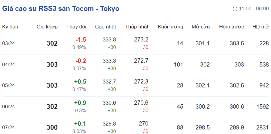 Tại Sở giao dịch hàng hóa Tokyo (TOCOM), giá cao su giao kỳ hạn tháng 3/2024 ghi nhận mức 302 yen/kg, giảm 0,49% tại thời điểm khảo sát vào lúc 6h50 (giờ Việt Nam).