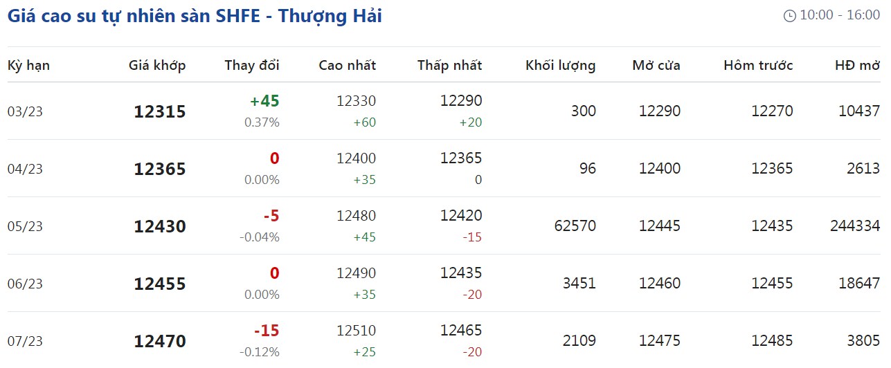 Trên Sàn giao dịch hàng hóa tương lai Thượng Hải (SHFE), giá cao su RSS3 giao kỳ hạn tháng 3/2023 được điều chỉnh lên mức 12.315 nhân dân tệ/tấn, tăng 0,37% (tương đương 45 nhân dân tệ) so với giao dịch trước đó.
