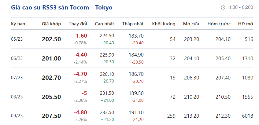 Tại Sở giao dịch hàng hóa Tokyo (TOCOM), giá cao su kỳ hạn giao tháng 5/2023 đạt mức 202,5 yen/kg, giảm 0,78% (tương đương 1,6 yen/kg) tại thời điểm khảo sát vào lúc 6h45 (giờ Việt Nam).