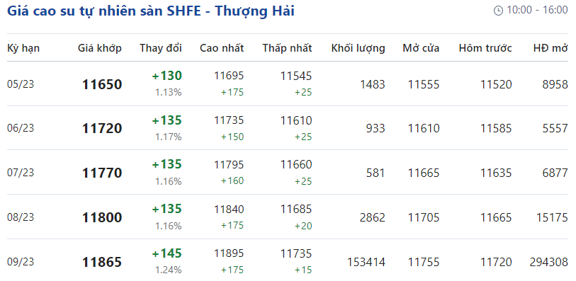 Trên Sàn giao dịch hàng hóa tương lai Thượng Hải (SHFE), giá cao su RSS3 giao kỳ hạn tháng 5/2023 được điều chỉnh lên mức 11.650 nhân dân tệ/tấn, tăng 1,13% (tương đương 130 nhân dân tệ) so với giao dịch trước đó.