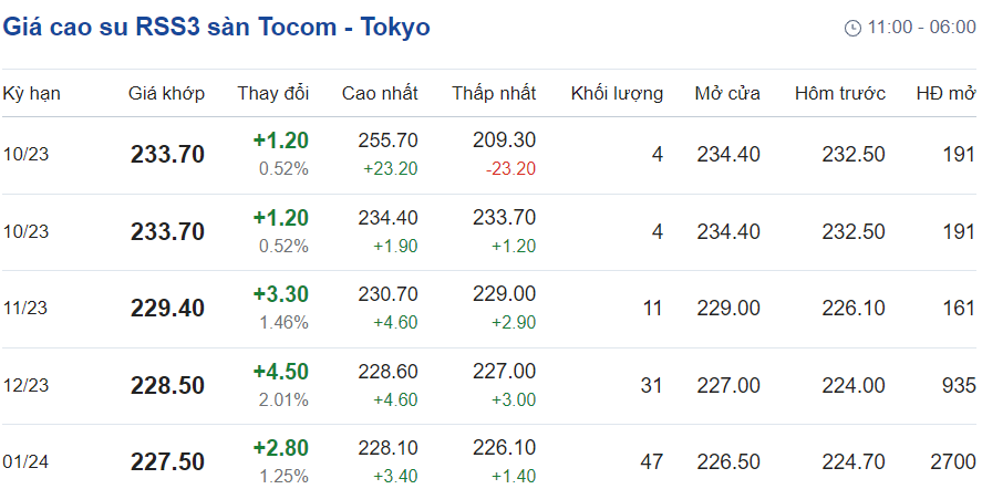 Tại Sở giao dịch hàng hóa Tokyo (TOCOM), giá cao su kỳ hạn giao tháng 10/2023 đạt mức 233,7 yen/kg, tăng 0,52% (tương đương 1,2 yen/kg) tại thời điểm khảo sát vào lúc 6h20 (giờ Việt Nam).
