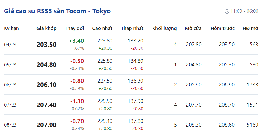 Kỳ hạn cao su tháng 5/2023; kỳ hạn cao su tháng 6/2023; kỳ hạn tháng 7/2023 và cao su kỳ hạn tháng 8/2023 đều giảm.