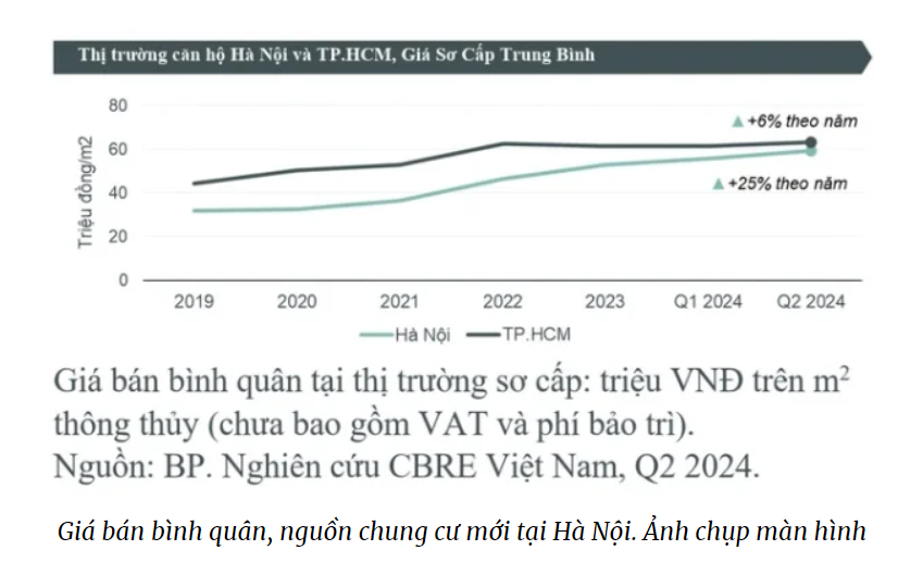 Nghiên cứu CBRE cũng cho thấy trong quý II, giá chung cư sơ cấp tại Hà Nội bình quân đã xấp xỉ 60 triệu đồng mỗi m2 (chưa gồm VAT, phí bảo trì). Mức này đã tăng 6,5% theo năm và gần 25% so với cùng kỳ năm ngoái. CBRE cho biết mặt bằng giá chung cư mới tại Hà Nội cũng chỉ còn kém TP HCM 3 triệu đồng một m2.