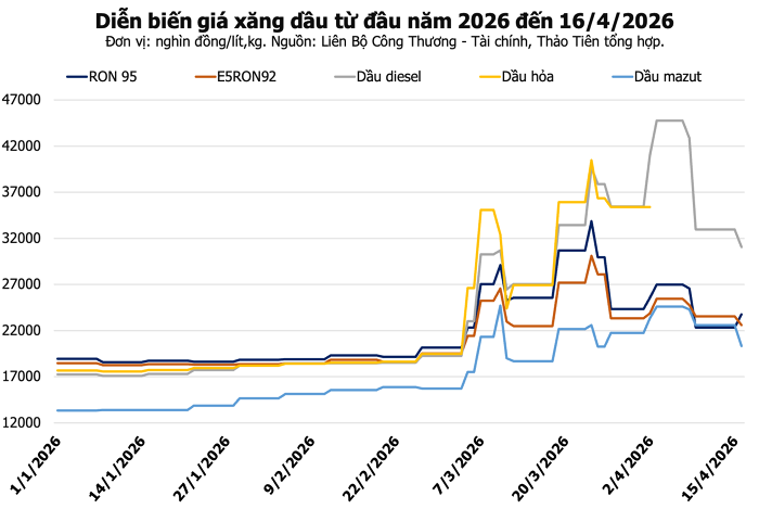 Cụ thể, xăng E5 RON92 tăng 248 đồng/lít lên 22.592 đồng/lít, xăng RON95-III cũng tăng 248 đồng/lít lên 23.761 đồng/lít. Ngược lại, dầu diesel 0.05S giảm 1.928 đồng/lít xuống còn 31.041 đồng/lít, còn dầu mazut 180CST 3.5S giảm 2.281 đồng/kg, về mức 20.332 đồng/kg. Mức giá mới chính thức có hiệu lực từ 0h ngày 16/4.