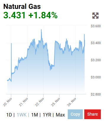 Theo ghi nhận trên trang Oilprice.com vào lúc 7h20h ngày 27/11/2024 (giờ Việt Nam), giá khí tự nhiên thế giới quay bật tăng 1,84% lên mức 3,431 USD/mmBTU đối với hợp đồng khí gas tự nhiên giao tháng 12/2024.