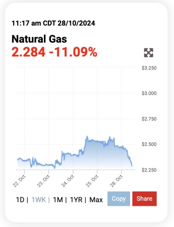 Theo Oilprice, giá khí đốt tự nhiên của Hoa Kỳ đã giảm mạnh vào thứ Hai (28/10) sau khi Israel tiến hành các cuộc tấn công hạn chế vào Iran trong khi Lãnh tụ tối cao Ayatollah Ali Khamenei giúp hạ nhiệt căng thẳng sau khi ông tuyên bố Iran sẽ không đáp trả trực tiếp các cuộc tấn công mới nhất của Israel.