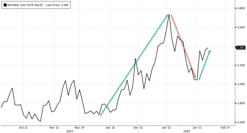 Các tính toán của Bloomberg dựa trên biến động 60 ngày cho thấy hợp đồng NatGas tháng 3 đã tăng vọt lên mức cao nhất từ trước đến nay, điều mà Elizabeth Elkin của Bloomberg chỉ ra là các nhà giao dịch " đang cố gắng tìm ra hướng đi cho khí đốt khi xuất khẩu LNG, nhu cầu ngày càng tăng về điện chạy bằng khí đốt để vận hành các trung tâm dữ liệu và mối đe dọa về thuế quan đang nổi lên như những động lực cơ bản tiềm năng trong một thị trường thường bị chi phối bởi những biến động của thời tiết ".