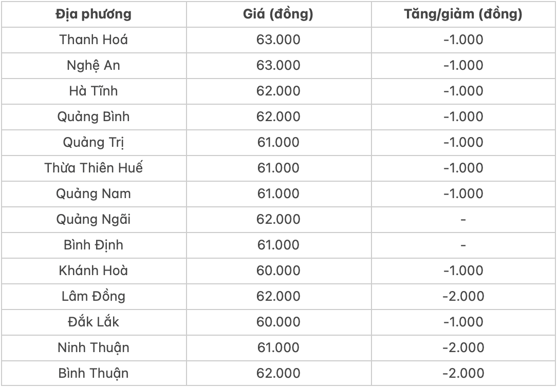 Hiện tại, thương lái miền Trung đang thu mua heo hơi từ 60.000 - 63.000 đồng/kg. Trong đó, Đắk Lắk và Khánh Hoà ghi nhận mức 60.000 đồng/kg, thấp nhất khu vực.
