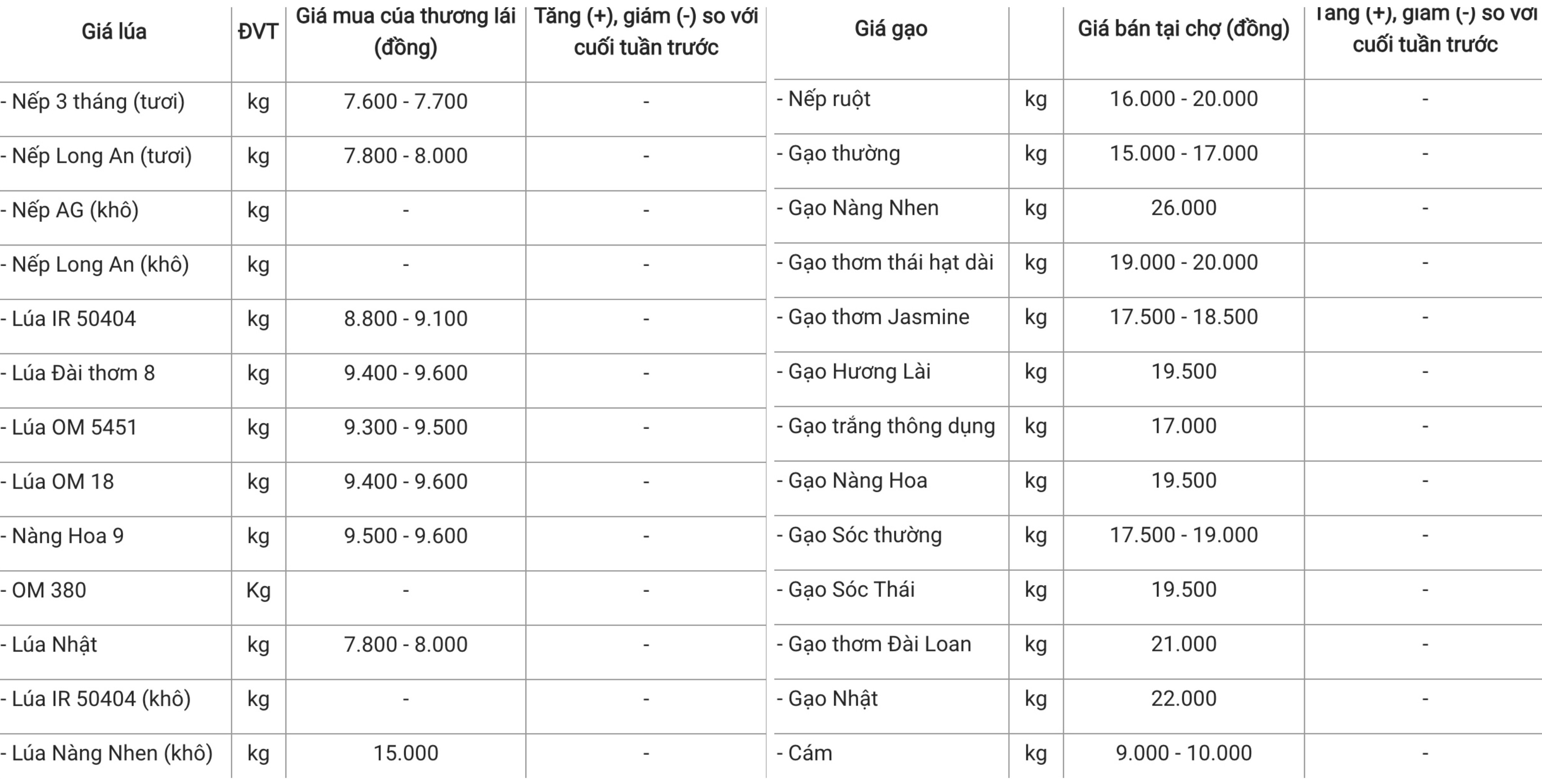 Giá các loại nếp duy trì ổn định. Hiện, nếp 3 tháng (tươi) và nếp Long An (tươi) được thu mua lần lượt với mức giá 7.600 - 7.700 đồng/kg và 7.800 - 8.000 đồng/kg. Trong khi đó, nếp Long An (khô) và nếp AG (khô) tạm dừng khảo sát trong hôm nay.