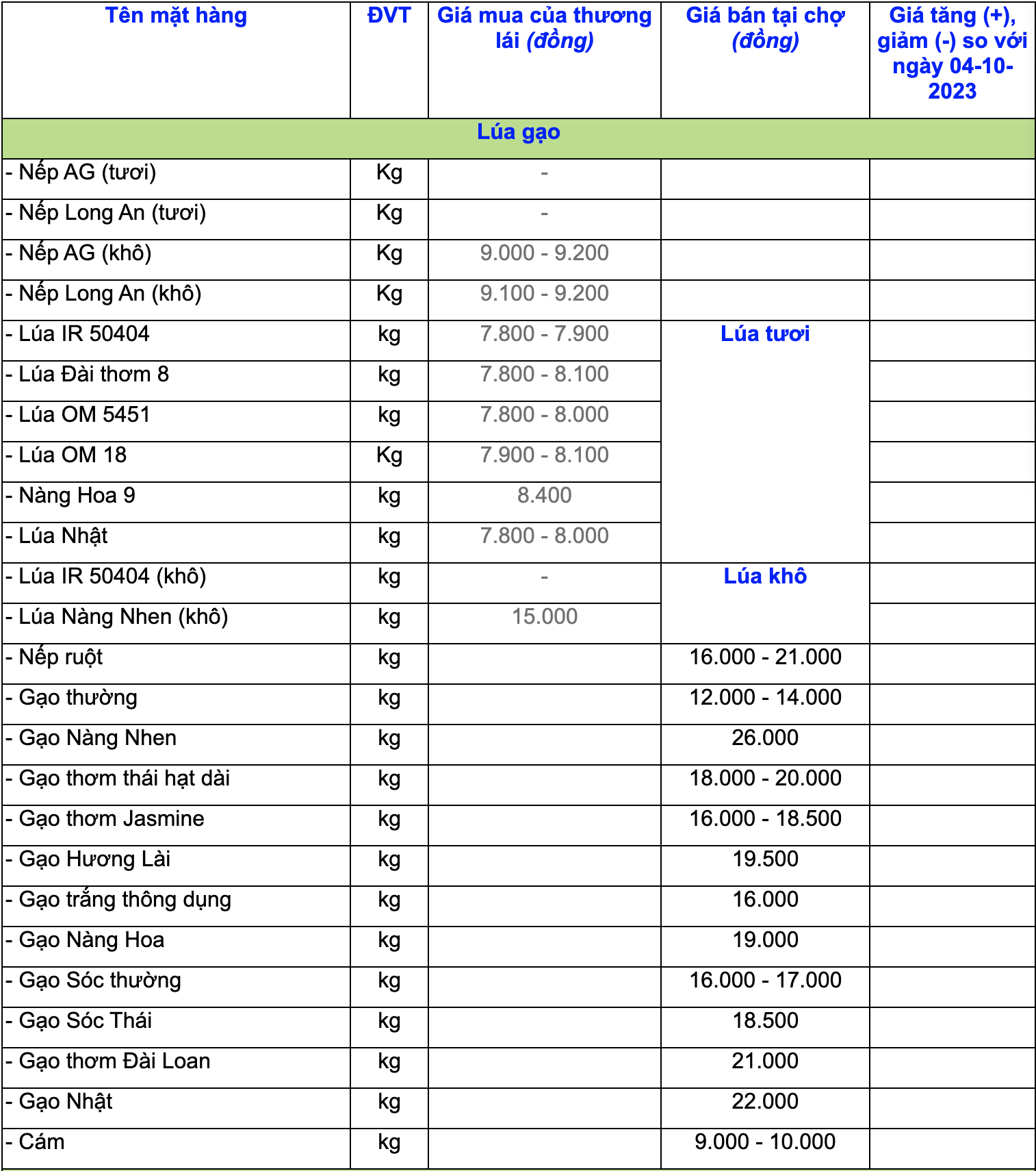 Bảng giá lúa gạo hôm nay 5/10 tại tỉnh An Giang. (Nguồn: Sở NN&PTNT An Giang).