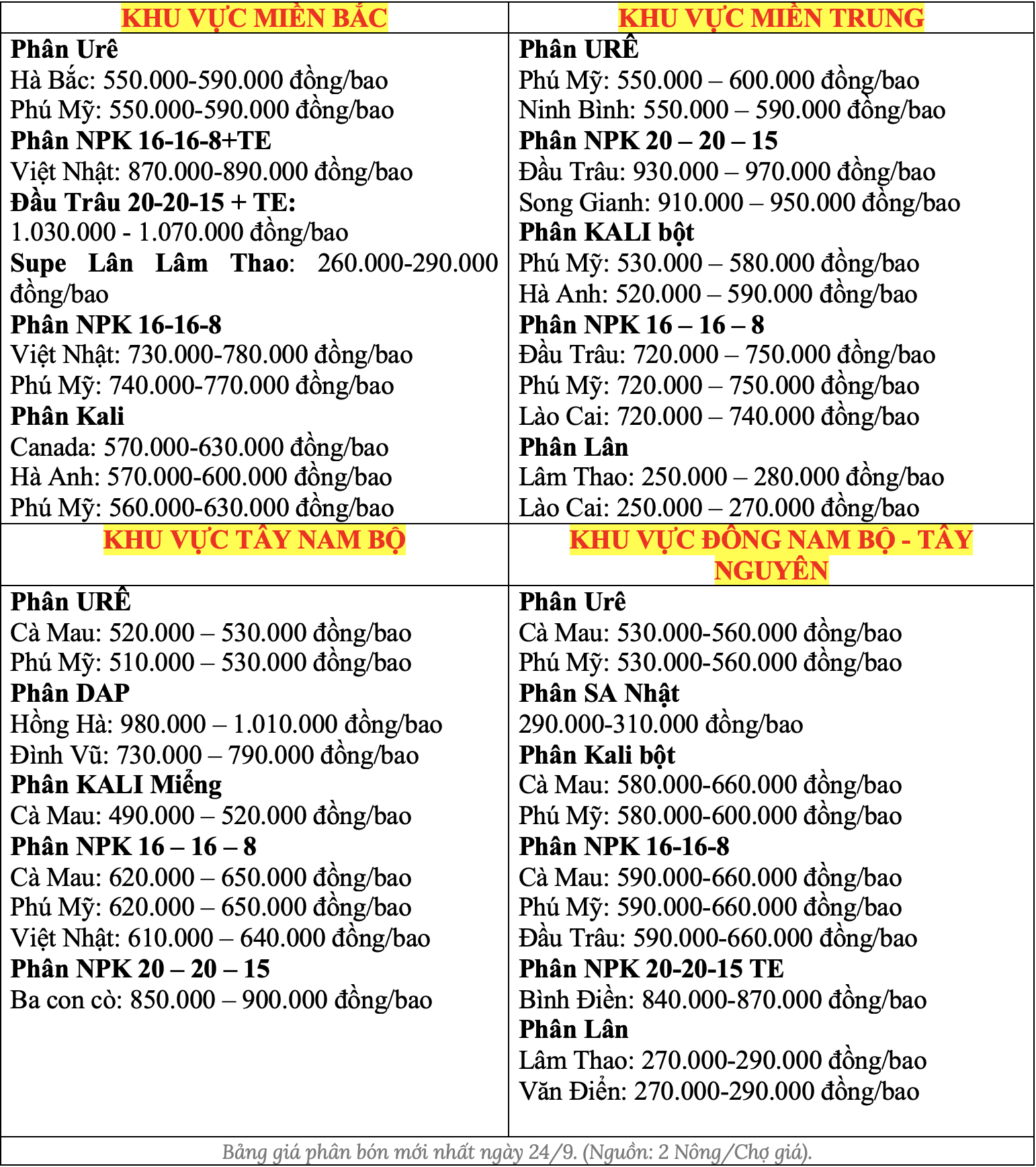 Sau khi tăng nhẹ ở một số khu vực của miền Bắc, giá phân bón hôm nay (24/9) đi ngang trên cả nước.