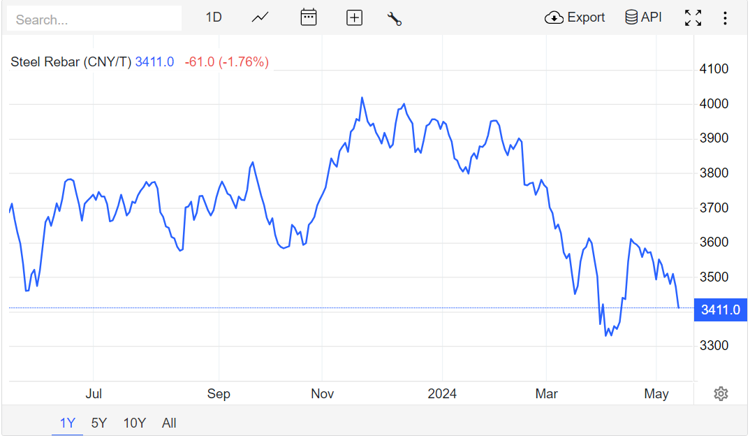Giá thép hôm nay ngày 16/5/2024, Giá thép giao tháng 9/2024 trên Sàn giao dịch Thượng Hải giảm 61 nhân dân tệ xuống mức 3.411 nhân dân tệ/tấn.