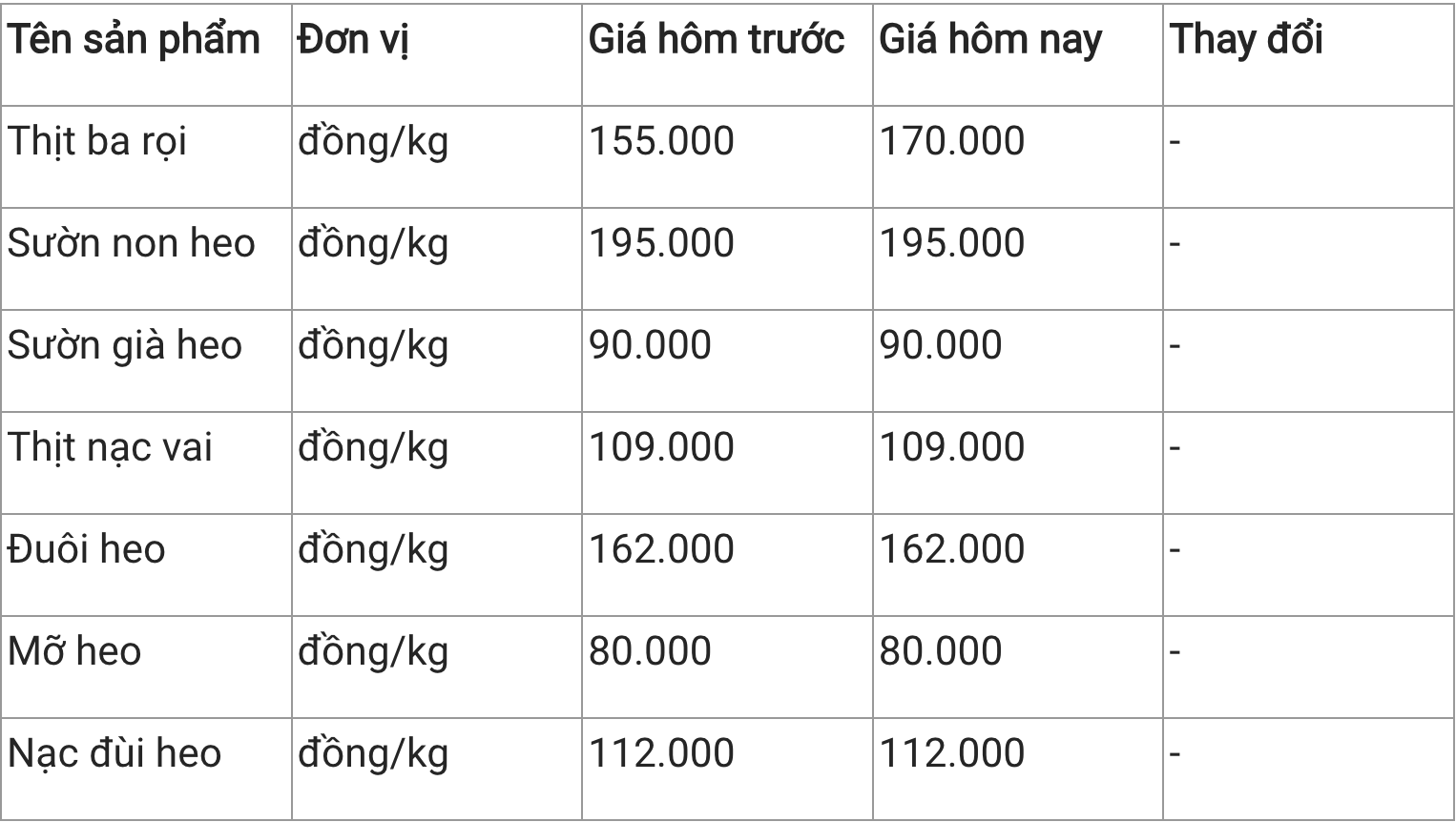 Tương tự, giá thịt heo tại Công ty Thực phẩm Tươi sống Hà Hiền cũng không xuất hiện biến động mới trong phiên giao dịch sáng nay. Hiện tại, các sản phẩm có giá bán dao động từ 80.000 - 195.000 đồng/kg.