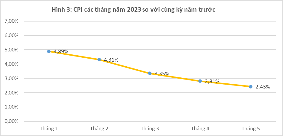 Theo Tổng cục Thống kê, chỉ số giá tiêu dùng các tháng từ đầu năm đến nay so với cùng kỳ năm trước có xu hướng giảm dần. Trong đó, CPI tháng Một tăng cao nhất với 4,89%, tháng Hai tăng 4,31%, tháng Ba tăng 3,35%, tháng Tư tăng 2,81% và đến tháng Năm mức tăng còn 2,43%.