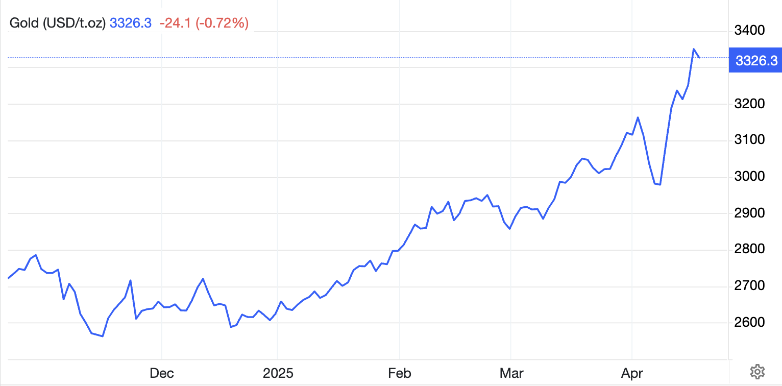Trong tuần giao dịch từ ngày 14 đến 20/4, thị trường vàng toàn cầu và trong nước chứng kiến những diễn biến sôi động, với mức tăng kỷ lục liên tiếp được thiết lập. Trên thị trường quốc tế, dù có phiên giao dịch ngắn do nghỉ lễ thứ Sáu, giá vàng giao ngay vẫn tăng mạnh 4,3%, chốt tuần ở mức 3.326 USD/ounce. Đặc biệt, trong phiên 17/4, vàng từng vươn lên đỉnh cao lịch sử mới là 3.350 USD/ounce.