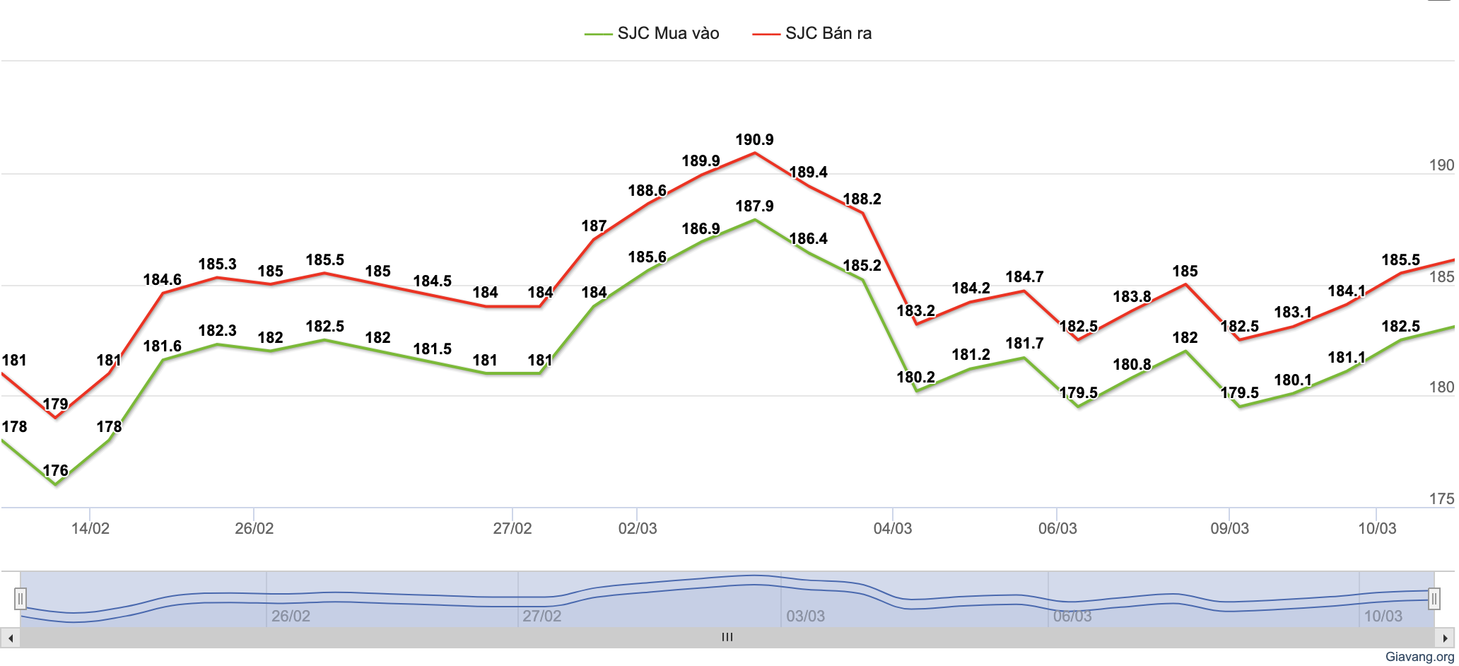 Giá vàng trong nước chiều 10/3 tiếp tục tăng, với vàng miếng SJC vượt mốc 186 triệu đồng/lượng theo đà đi lên của thị trường thế giới. Tuy nhiên, chênh lệch giá mua – bán đang bị kéo giãn mạnh, tiềm ẩn rủi ro cho nhà đầu tư ngắn hạn.