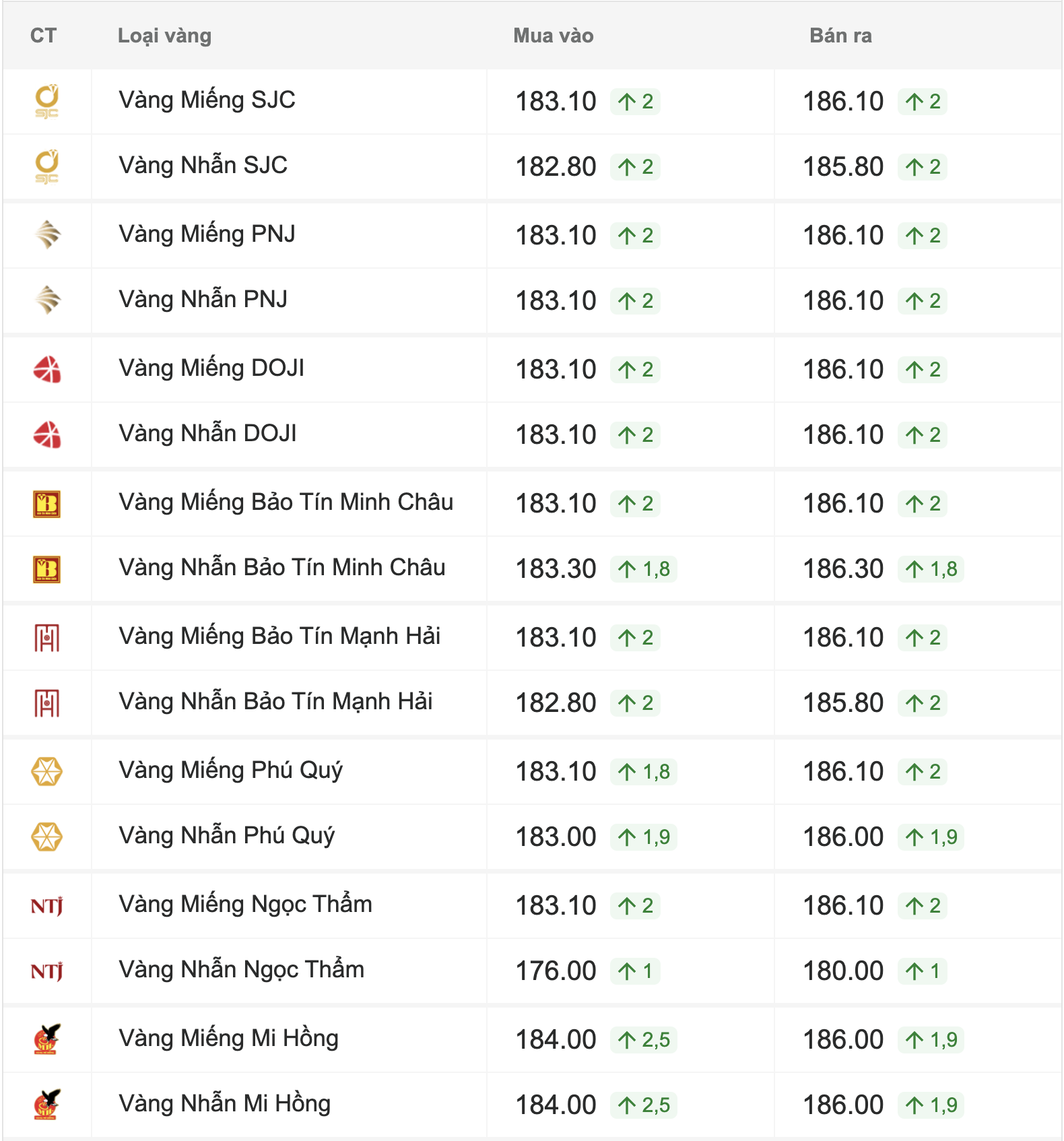 Tại Tập đoàn DOJI, giá vàng miếng được điều chỉnh lên 183,15 – 186,2 triệu đồng/lượng. Các sản phẩm vàng nhẫn và nữ trang 99,99% cũng được nâng lên quanh mức 180,8 – 184,3 triệu đồng/lượng. Trong khi đó, PNJ và Phú Quý cũng nhanh chóng điều chỉnh giá vàng miếng bán ra vượt mốc 186,1 triệu đồng/lượng, đồng thời nâng giá vàng nhẫn theo xu hướng tăng của toàn thị trường.