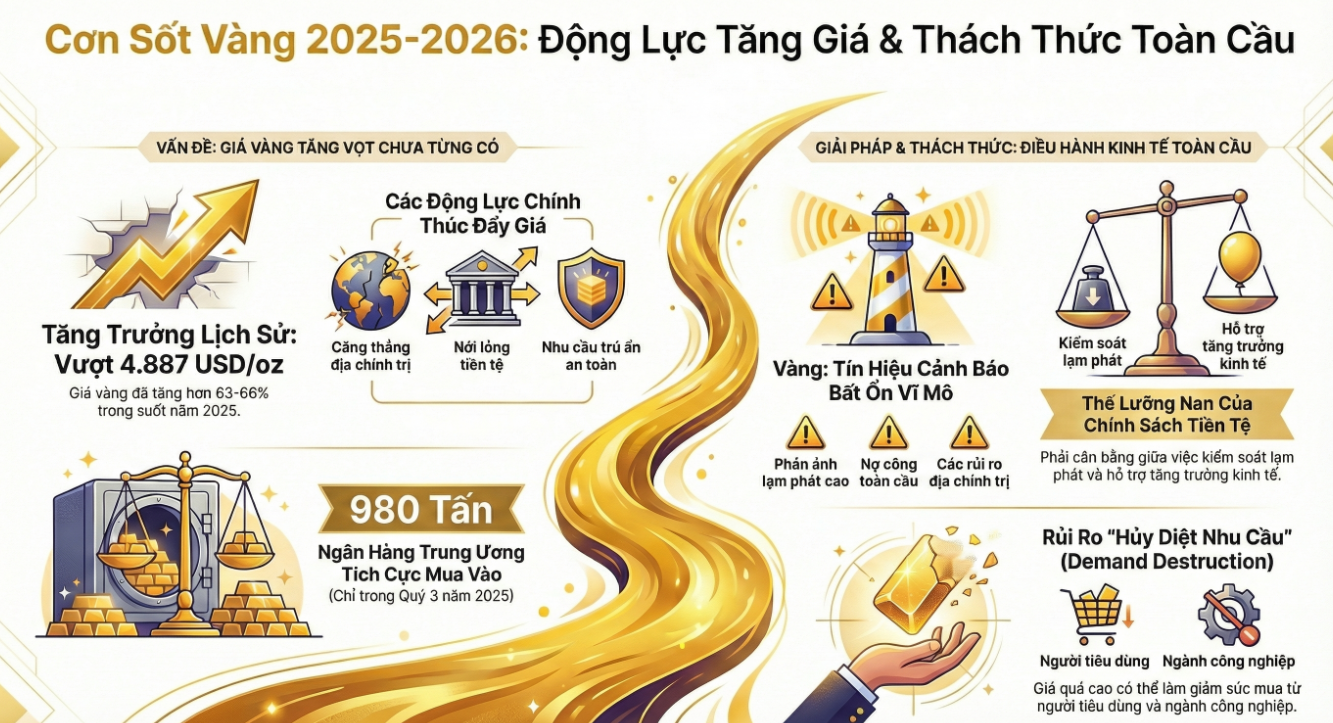 Sự kết hợp của các yếu tố trên khiến giá vàng thế giới không chỉ tăng mà còn biến động mạnh theo từng giai đoạn, phản ánh tâm lý nhạy cảm của thị trường trước mọi thông tin kinh tế - chính trị. Đối với các nền kinh tế đang phát triển, trong đó có Việt Nam, biến động giá vàng thế giới đặt ra nhiều thách thức tiềm ẩn, đặc biệt khi vàng vẫn giữ vai trò nhất định trong đời sống tài chính của người dân. Đứng trước bối cảnh đó, Chính phủ Việt Nam đã có nhiều quyết sách, điều chỉnh hợp lý giúp cho nền kinh tế vĩ mô tăng trưởng ổn định