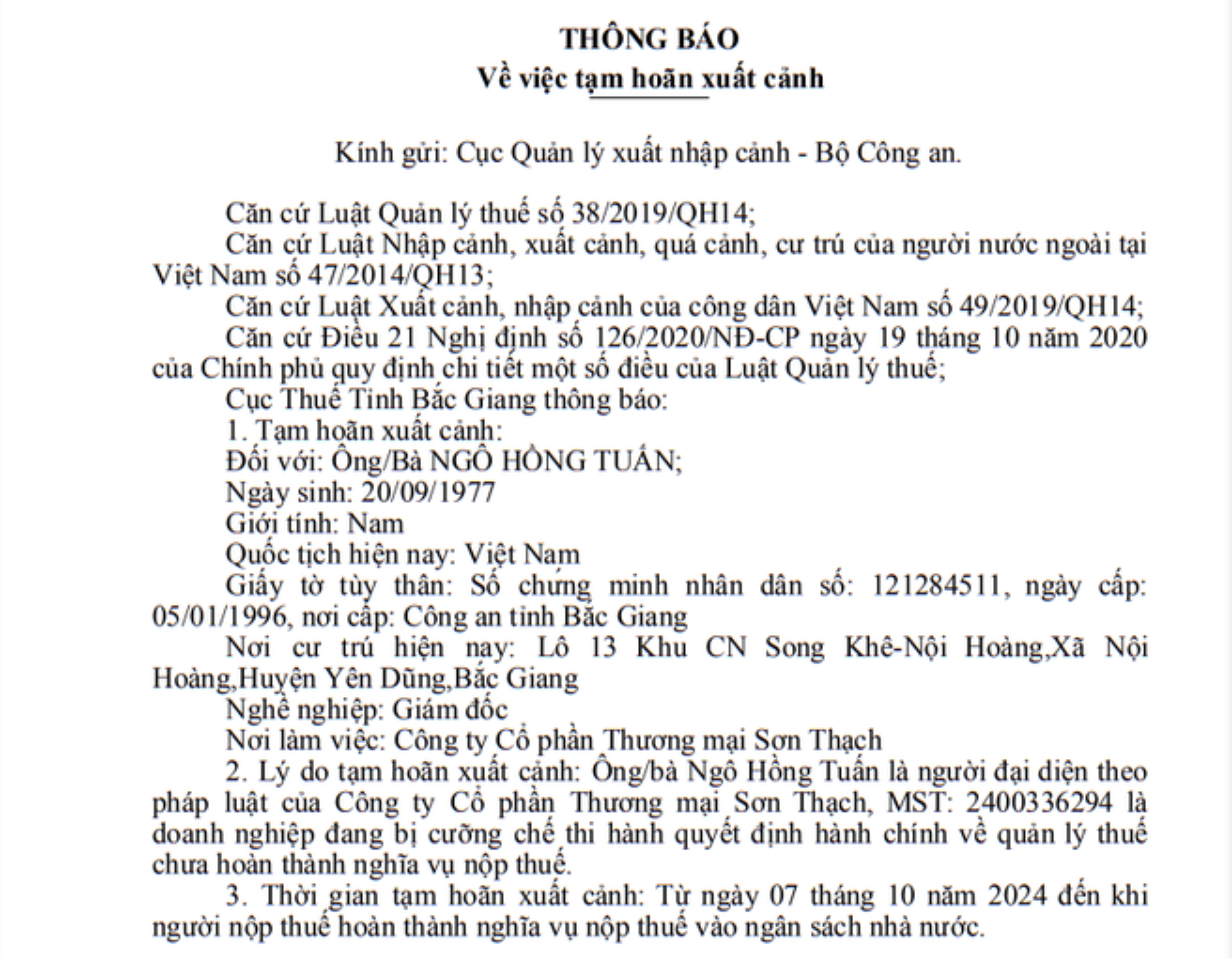Cục Thuế tỉnh Bắc Giang đã ban hành thông báo số 04/TBXC-CTBGI-KDT do Phó Cục trưởng Đỗ Mạnh Hùng ký, gửi tới Cục Quản lý xuất nhập cảnh - Bộ Công an thông báo tạm hoãn xuất cảnh đối với ông Ngô Hồng Tuấn, (SN 1977); Nơi cư trú hiện nay: Lô 13 Khu CN Song Khê - Nội Hoàng, xã Nội Hoàng, huyện Yên Dũng, Bắc Giang.
