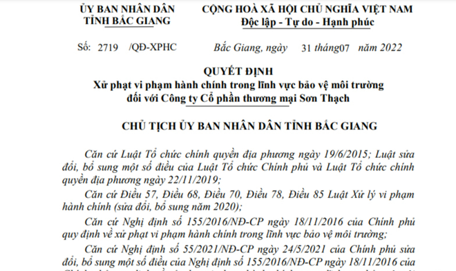 Quyết định xử phạt Công ty Cổ phần thương mại Sơn Thạch hồi cuối tháng 7/2022.