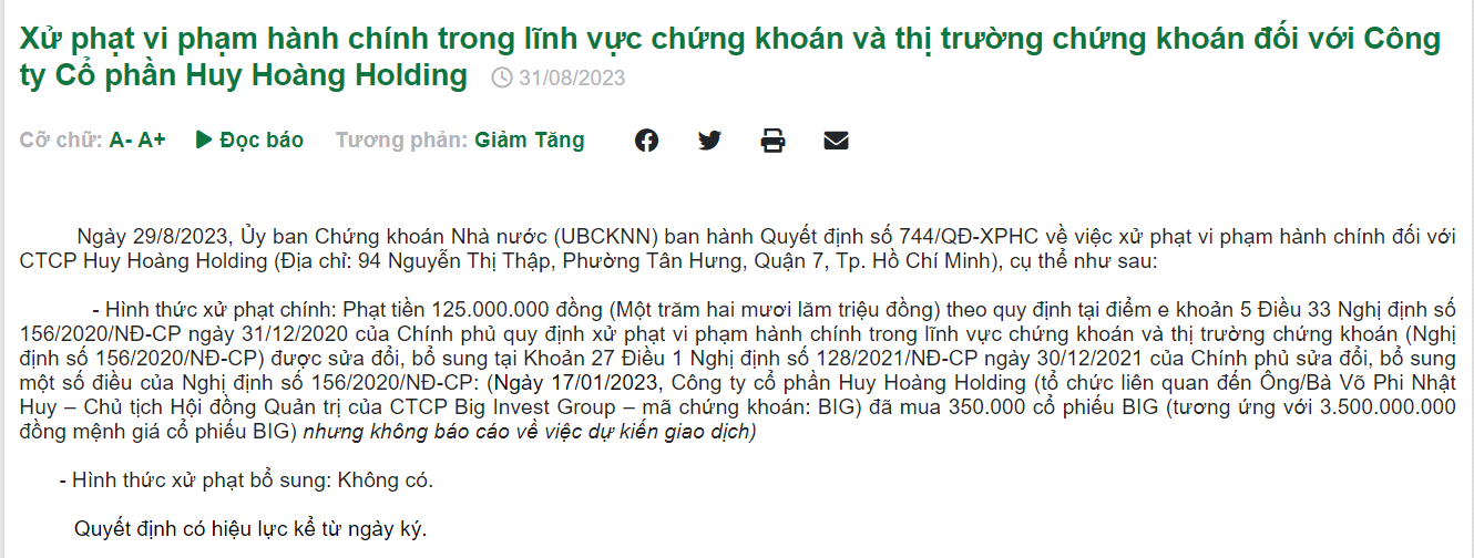 Theo đó, Huy Hoàng Holding đã phải nộp số tiền 125 triệu đồng theo quy định tại điểm e khoản 5 Điều 33 Nghị định số 156/2020 ngày 31/12/2020 của Chính phủ quy định xử phạt vi phạm hành chính trong lĩnh vực chứng khoán và thị trường chứng khoán, Nghị định số 156/2020 được sửa đổi, bổ sung tại Khoản 27 Điều 1 Nghị định số 128/2021 ngày 30/12/2021 của Chính phủ sửa đổi, bổ sung một số điều của Nghị định số 156/2020.