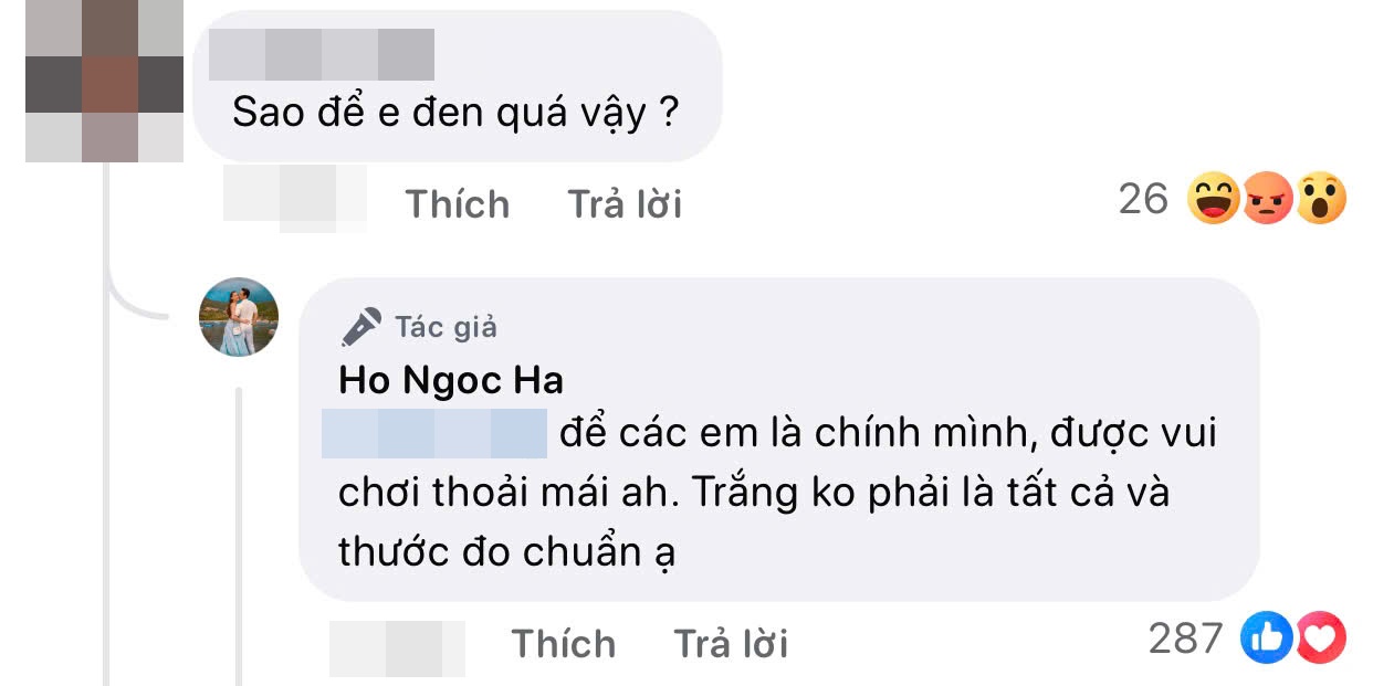 Trước lời nhận xét không mấy tích cực về con gái, Hà Hồ thẳng thắn đáp trả: "Để các em là chính mình, được vui chơi thoải mái ạ. Trắng không phải là tất cả và thước đo chuẩn".
