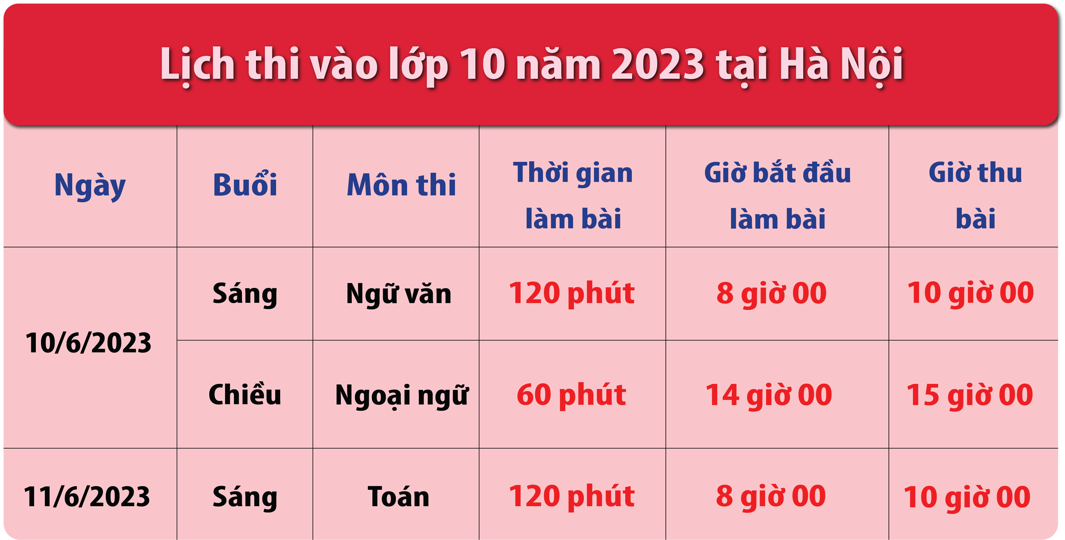 Sở Giáo dục và Đào tạo (GD&ĐT) Hà Nội mới công bố lịch thi tuyển sinh vào lớp 10 Trung học phổ thông (THPT) năm học 2023-2024.