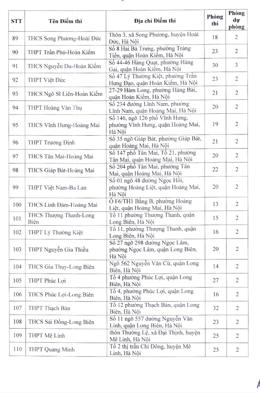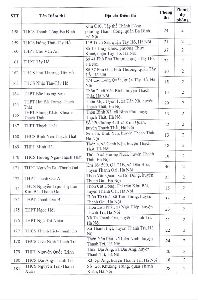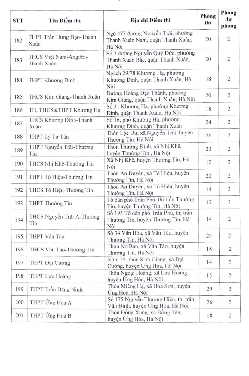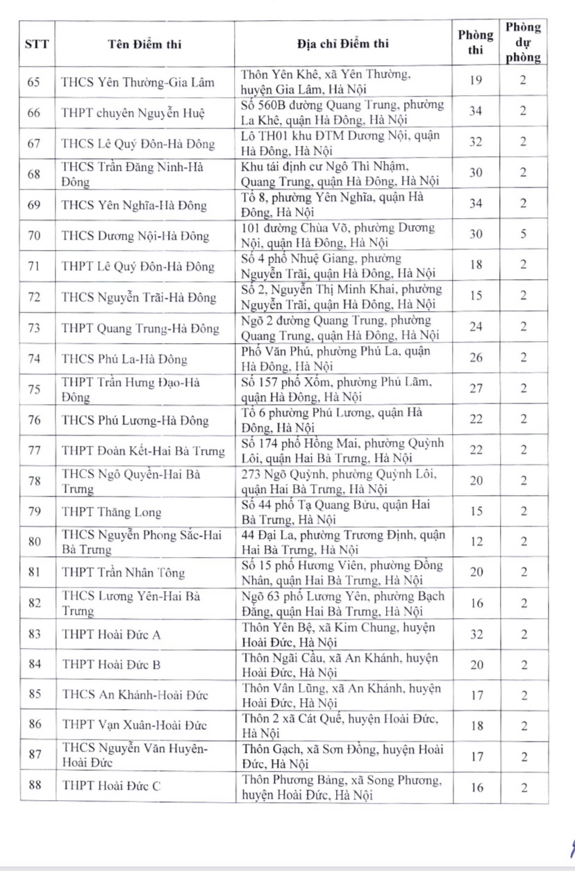 Một số điểm thi có nhiều phòng thi như Trung học Phổ thông Nguyễn Du-Thanh Oai (40 phòng thi); Trung học Phổ thông Xuân Mai (39 phòng thi); Trung học Phổ thông Khương Đình, Trung học Cơ sở Trần Duy Hưng-Cầu Giấy, Trung học Phổ thông Chúc Động (38 phòng thi); Trung học Phổ thông Chu Văn An, Trung học Phổ thông Quốc Oai (37 phòng thi); Trung học Phổ thông Ngọc Tảo (35 phòng thi); Trung học Phổ thông Cao Bá Quát-Gia Lâm, Trung học Phổ thông Chuyên Nguyễn Huệ, Trung học Cơ sở Yên Nghĩa-Hà Đông (34 phòng thi)...