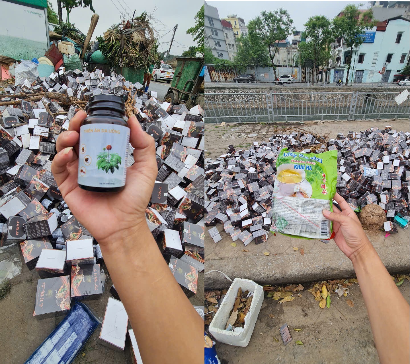 Nhiều người dân và nhân viên thu gom rác tại khu vực đường Nguyễn Lân (Thanh Xuân) bất ngờ phát hiện hàng trăm hộp sản phẩm thực phẩm bảo vệ sức khỏe đổ ra tràn lan ra đường