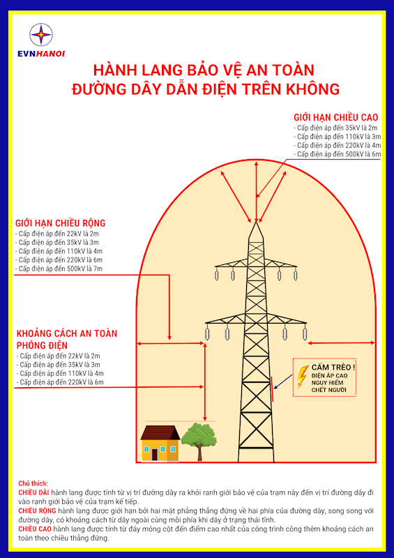 Để công tác bảo vệ hành lang an toàn lưới điện ngày càng hiệu quả, tránh xảy ra sự cố, gây thiệt hại cho lưới điện cũng như ngăn chặn nguy cơ xảy ra tai nạn đối với con người. EVNHANOI khuyến cáo các công trình, dự án xây dựng ngay từ khi lập các dự án, thiết kế cần phải khảo sát kỹ các nội, dự toán kinh phí cho công tác giải phóng hành lang an toàn lưới điện theo đúng Luật Điện lực.