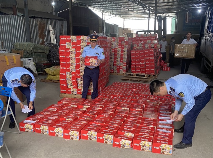 Ngày 12/4, Đội QLTT số 1, Cục QLTT Hà Nội kiểm tra và phát hiện 1.300 thùng bánh trên bao bì thể hiện chữ tượng hình, đại diện doanh nghiệp không xuất trình được giấy tờ hợp pháp liên quan đến lô hàng.
