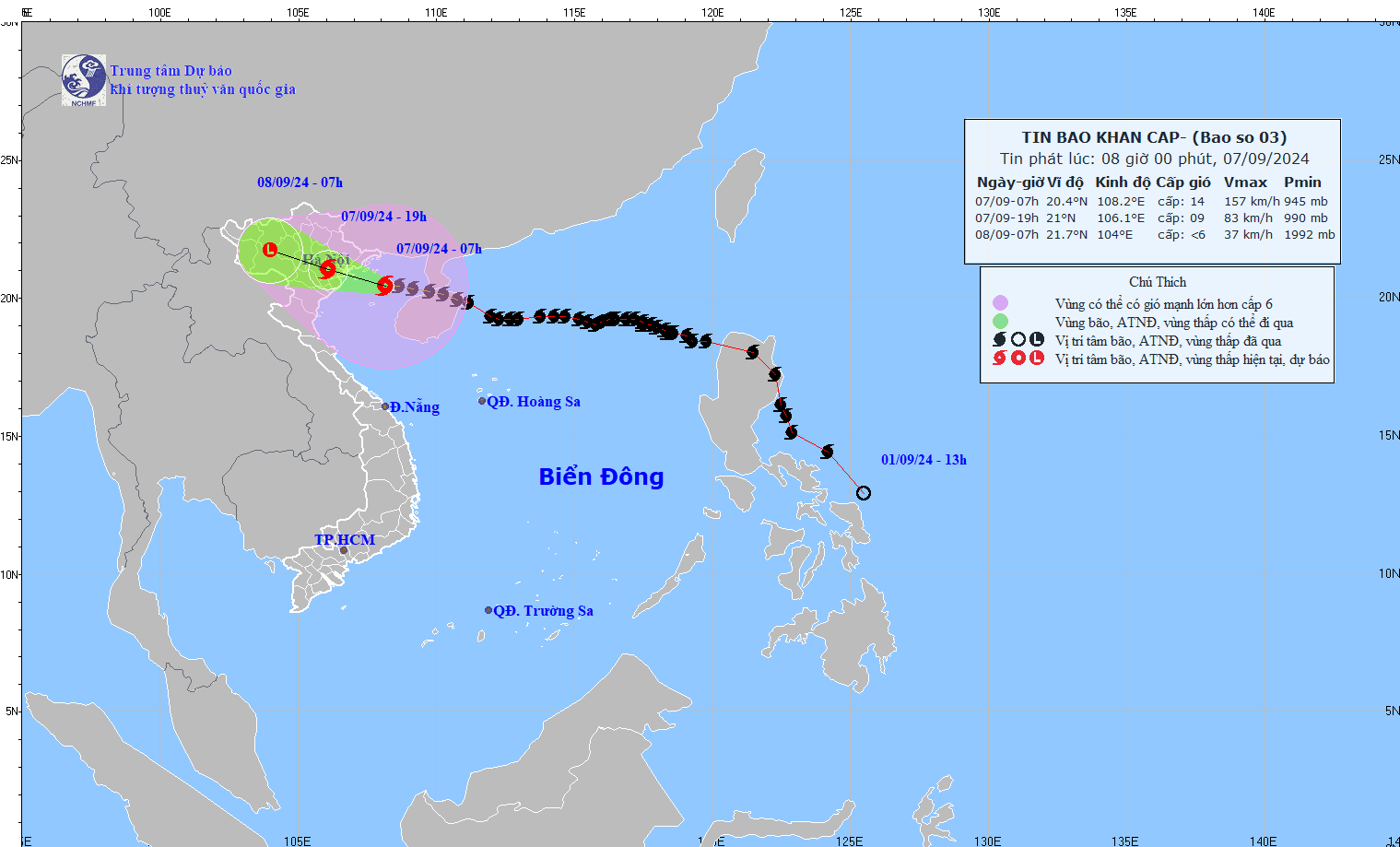 Lúc 09 giờ ngày 07/9, vị trí tâm bão ở khoảng 20.5 độ Vĩ Bắc; 107.8 độ Kinh Đông, trên vùng biển Quảng Ninh – Hải Phòng