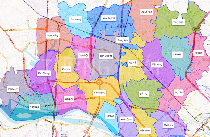Bản đồ vị trí các xã khi thành lập phường trong đề án huyện Động Anh lên quận. Nguồn: UBND huyện Đông Anh.