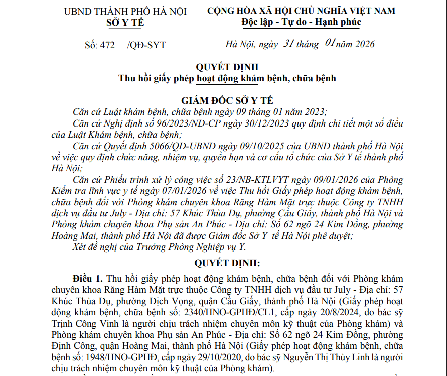 Hai cơ sở khám chữa bệnh Phòng khám chuyên khoa Răng Hàm Mặt trực thuộc Công ty TNHH dịch vụ đầu tư July và Phòng khám chuyên khoa Phụ sản An Phúc không được thực hiện hoạt động chuyên môn khám bệnh, chữa bệnh kể từ ngày quyết định có hiệu lực.
